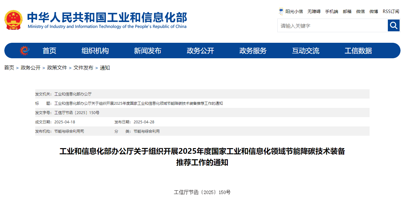 4月28日,工業(yè)和信息化部辦公廳發(fā)布通知,組織開(kāi)展2025年度國(guó)家工業(yè)和信息化領(lǐng)域節(jié)能降碳技術(shù)裝備推薦工作。