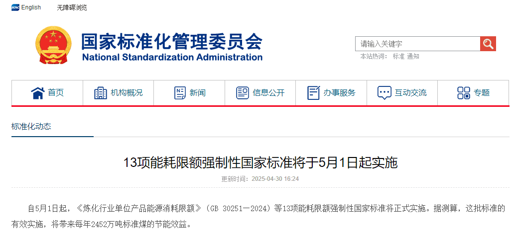 4月30日,國(guó)家標(biāo)準(zhǔn)化委員會(huì)消息,自5月1日起,《煉化行業(yè)單位產(chǎn)品能源消耗限額》(GB 30251—2024)等13項(xiàng)能耗限額強(qiáng)制性國(guó)家標(biāo)準(zhǔn)正式實(shí)施。據(jù)測(cè)算,這批標(biāo)準(zhǔn)的有效實(shí)施,將帶來(lái)每年2452萬(wàn)噸標(biāo)準(zhǔn)煤的節(jié)能效益。