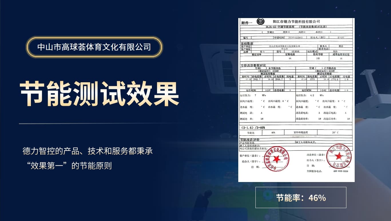 以實(shí)際案例為例,去年12月,德力智控為中山市高球薈體育文化有限公司的空調(diào)提供節(jié)能改造實(shí)地打樣服務(wù),節(jié)能率達(dá)到46%,有效降低了運(yùn)營(yíng)成本,非常符合政策標(biāo)準(zhǔn)的要求。
