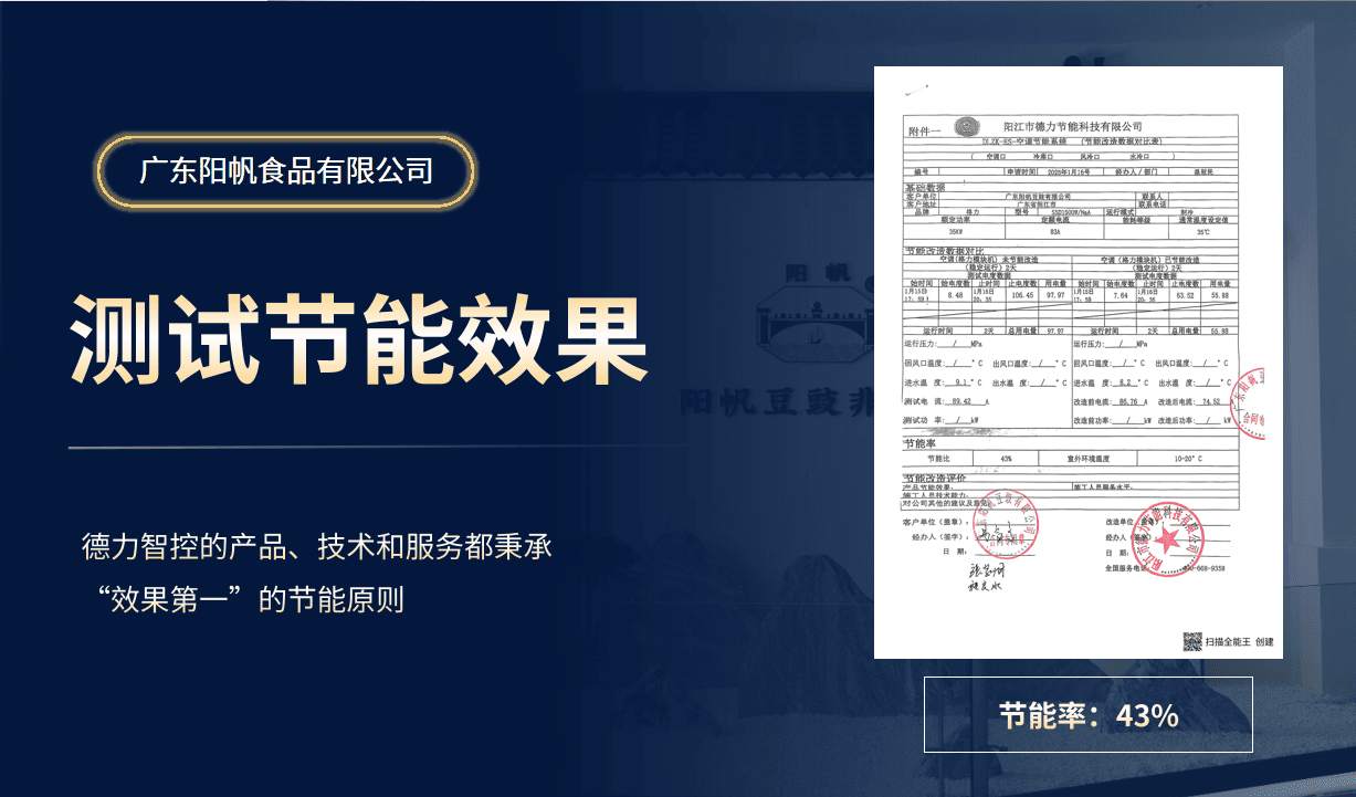 就以食品加工企業為例,今年1月,德力智控為廣東陽帆豆豉有限公司(以下簡稱:陽帆食品)的空調實施節能改造,實地打樣節能率43%!從陽帆食品目前的電費情況來看,其空調電費有了明顯下降,不僅為企業節省了大量的運營成本,也間接地給該公司創造了一定的經濟效益!
