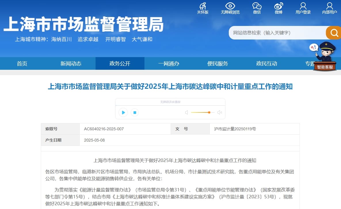5月8日,上海市監督管理局發布《關于做好2025年上海市碳達峰碳中和計量重點工作》的通知,明確提出鼓勵在重點領域、重點區域開展能源資源計量示范試點,要完善碳排放計量標準體系,支持保障本市加快打造綠色低碳供應鏈。