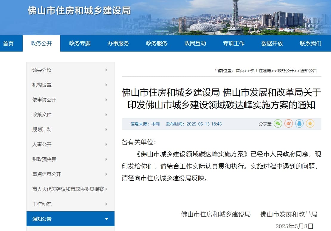 5月13日,佛山市住房和城鄉建設局、發展和改革局聚焦建筑節能改造、綠色建筑推廣、可再生能源應用等重點任務,聯合印發了《佛山市城鄉建設領域碳達峰實施方案》。(以下簡稱:《佛山碳達峰方案》)