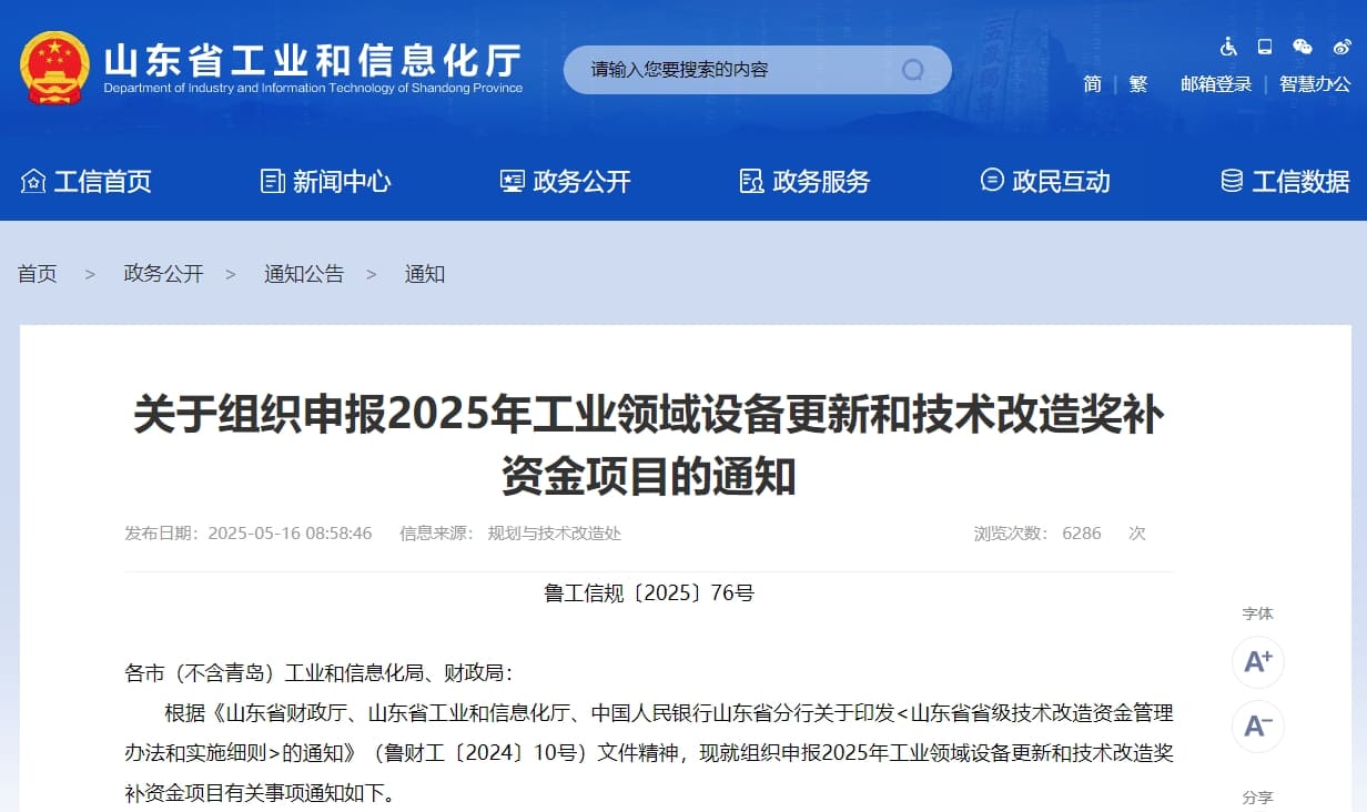 5月15日,山東省工業和信息化廳、財政廳發布《關于組織申報2025年工業領域設備更新和技術改造獎補資金項目》的通知。