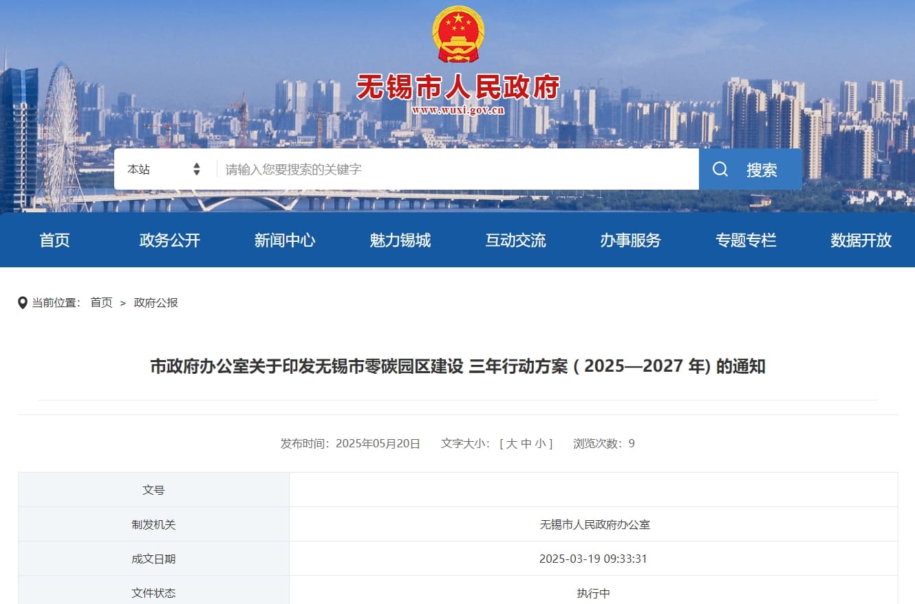 5月20日,江蘇省無錫市政府辦公室印發《無錫市零碳園區建設三年行動方案(2025—2027年)》 ,明確提出要通過實施能源結構優化、節能降碳改造、智慧能源管理等措施,打造一批具有示范引領作用的零碳園區。
