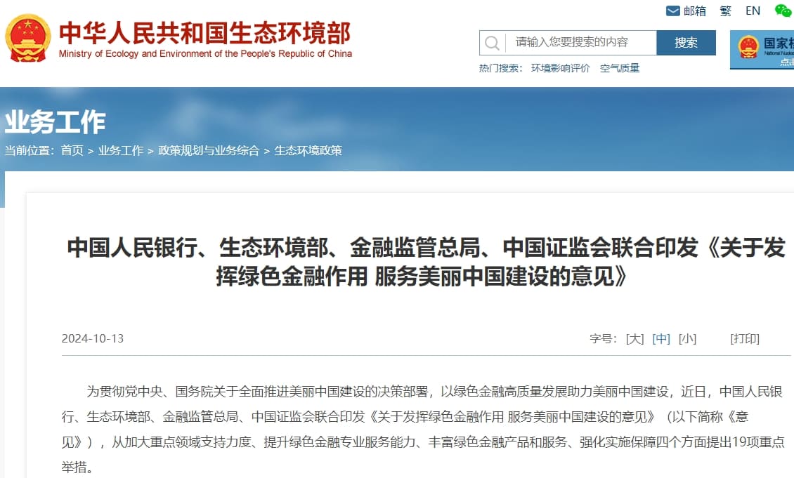 近日,中國人民銀行等四部門,聯(lián)合印發(fā)了《關(guān)于發(fā)揮綠色金融作用 服務美麗中國建設的意見》(以下簡稱《意見》),從加大重點領域的支持力度、提升綠色金融專業(yè)服務能力等四個方面提出了重點舉措。
