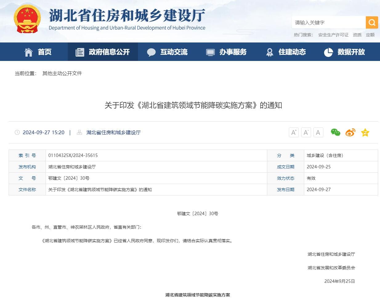 湖北省住建廳、發(fā)改委印發(fā)《湖北省建筑領域節(jié)能降碳實施方案》(以下簡稱《實施方案》)。
