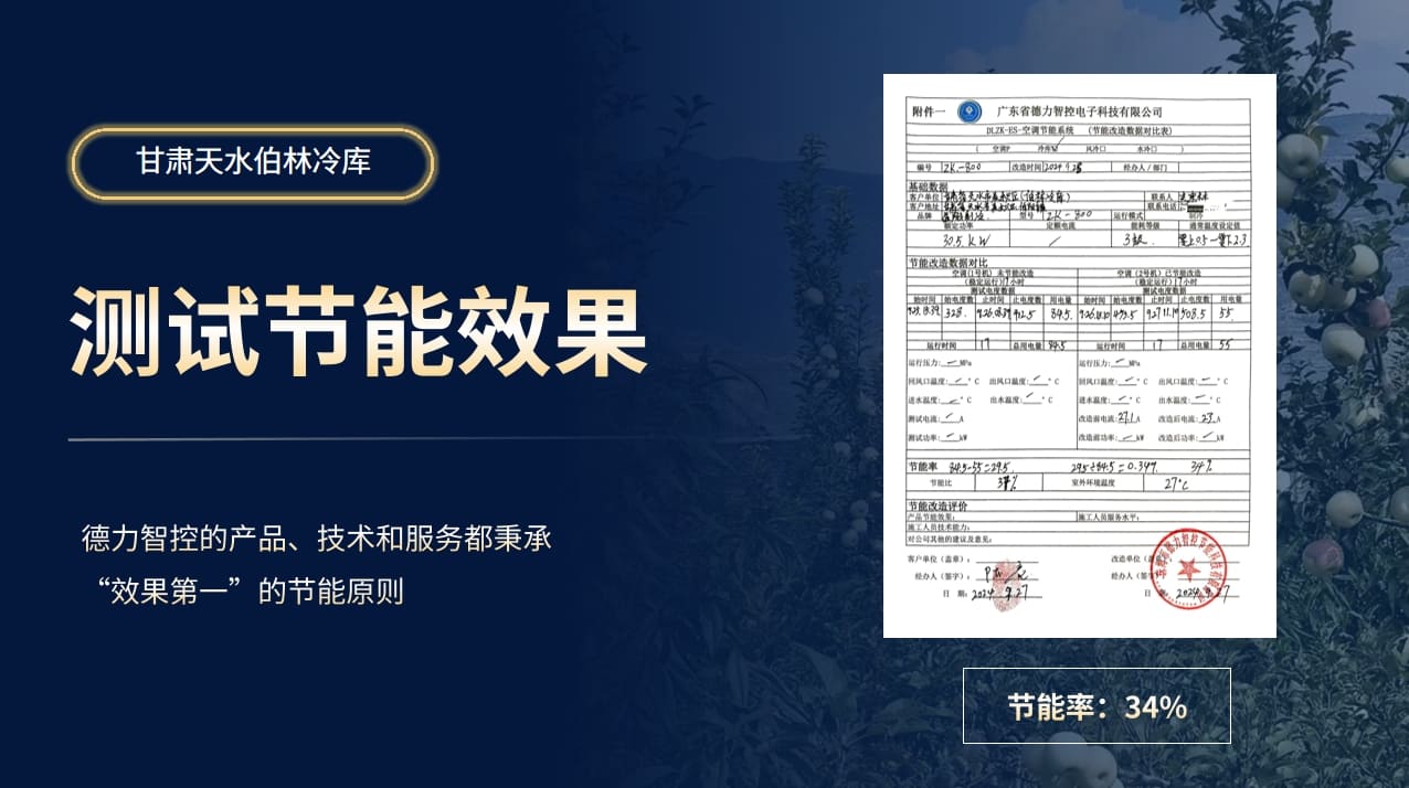 與傳統(tǒng)的合同能源管理、更換節(jié)能設備等措施不一樣,德力智控空調(diào)節(jié)能改造是從設備能耗源頭處理,施工快,也不會影響設備使用。就以甘肅天水的伯林冷庫為例,(具體詳情 點擊查看)此次實地打樣節(jié)能率34%,也不影響其制冷效果,基地工作人員非常滿意!